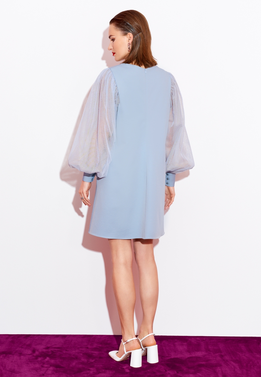 Платье женское, А-силуэта, длиной выше линии колен. V-образный вырез горловины. Рукава из отделочной ткани, втачные, объемные, со сборкой на манжетах, с петлями и пуговицами. Потайная молния в среднем шве спинки.