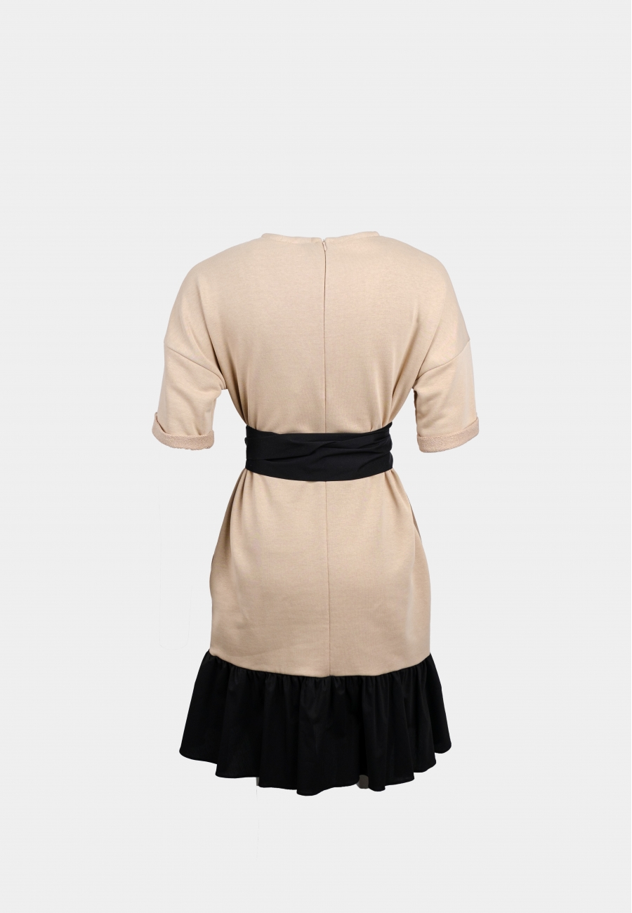 Платье женское, прямого кроя, длиной выше линии колен. Округлый вырез горловины. Рукава спущенные, короткие, с отворотами. По низу платья притачная деталь со сборкой из отделочной ткани. Мягкий пояс-бант из отделочной ткани. Потайная молния в среднем шве спинки.