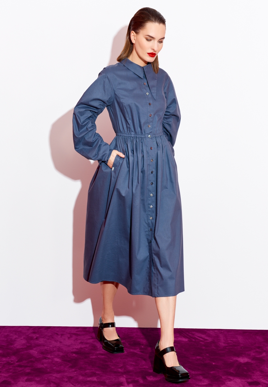 Платье женское, длиной ниже линии колен, прилегающего силуэта. По линии талии горизонтальный подрез, по юбке сборка от линии подреза. Воротник стояче-отложной асимметричной формы. Линия проймы спущена, объёмные рукава со сборкой и манжетами с петлями и пуговицами по низу. Застёжка платья на петли и пуговицы по планке спереди. Платье идёт в комплекте с поясом.