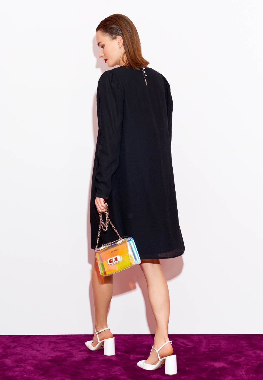 Платье женское, А-силуэта, длиной выше линии колен. V-образный вырез горловины. Рукава втачные, со сборкой по окату. Застежка "капелька" на навесные петли и пуговицы.