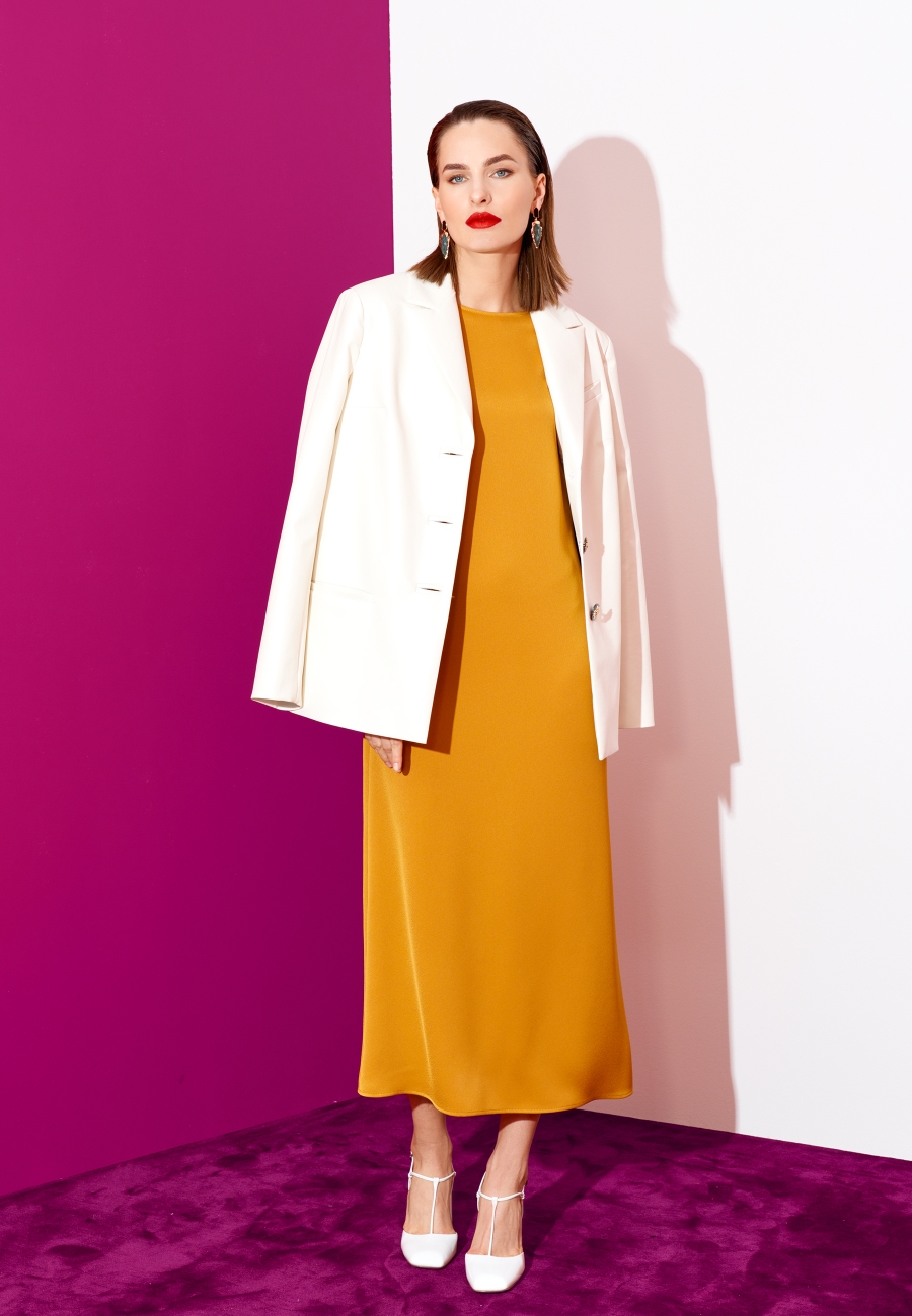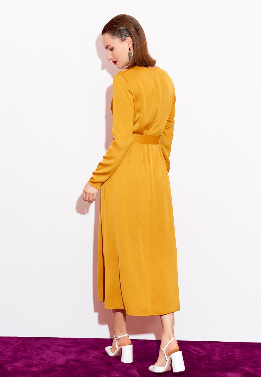Платье женское, длиной миди, полуприлегающего силуэта. Округлый вырез горловины. Рукава втачные, с потайными молниями в швах по низу. Потайная молния в среднем шве спинки. Пояс из основной ткани с пряжкой.