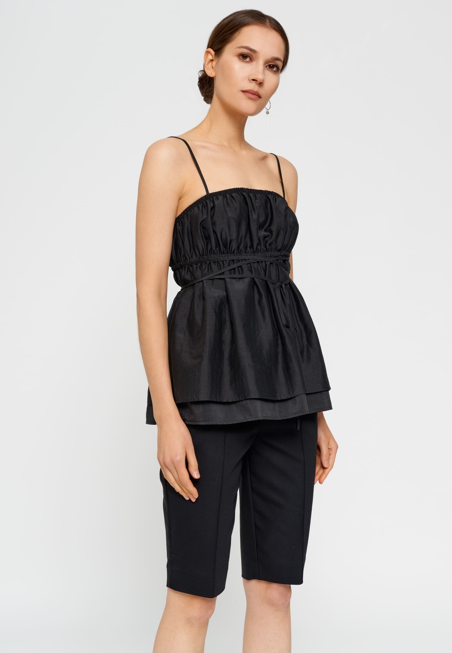Шорты классические, удлиненные, длиной чуть выше колен. Пояс отрезной. Сзади кокетка и декоративные листочки. Впереди карманы в боковых швах. Застежка на поясе на тесьму-молнию в гульфик и металлический крючок.