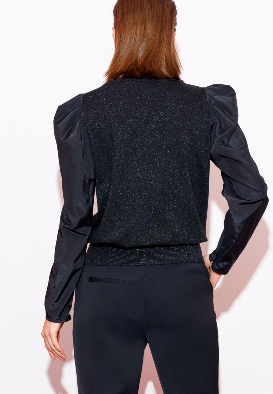 Нарядный свитер выполнен из итальянской пряжи люрексом. Длинный рукав "фонарик" из отделочной ткани с тактичным блеском, зауженный к низу. Отложной воротник-стойка.