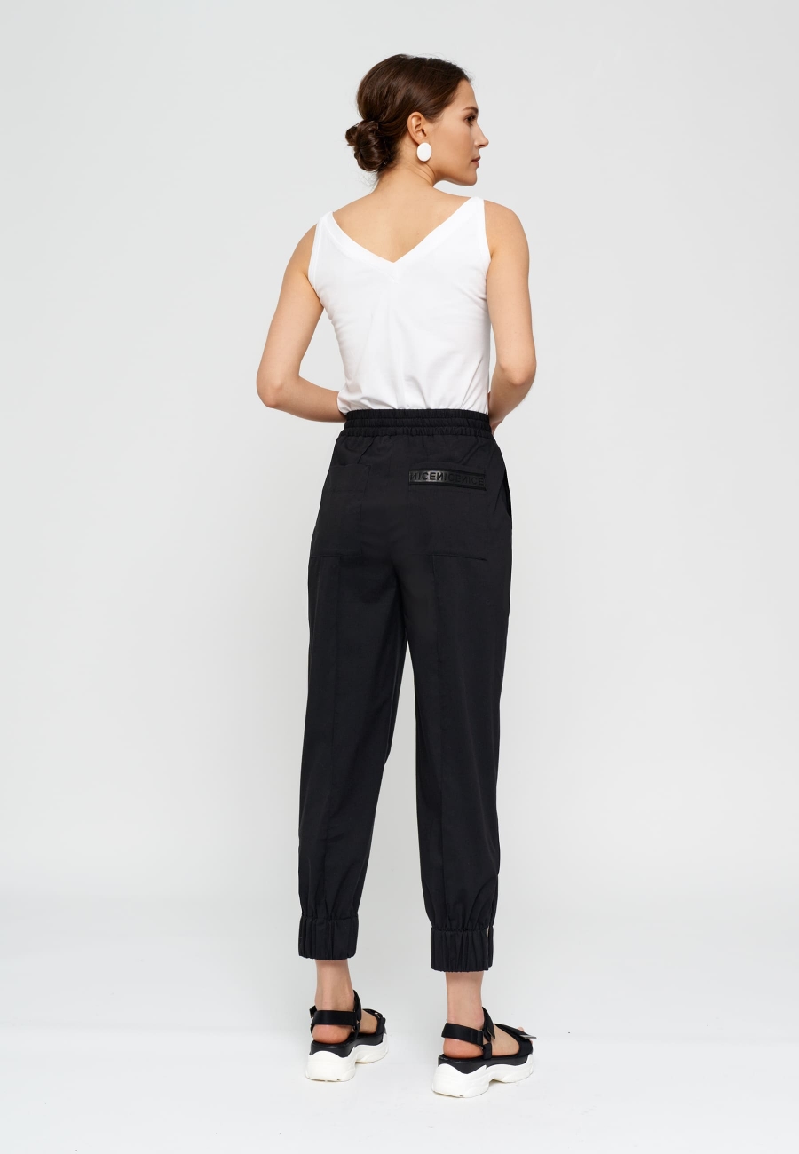Туника женская, прилегающего кроя. Округлый вырез горловины, без рукавов, с "американской" проймой. Горловина и проймы окантованы. Пришивной декоративный элемент с лого на спинке.