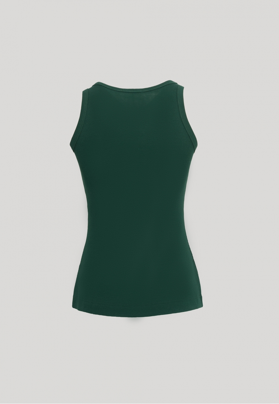 Туника женская, прилегающего кроя. Округлый вырез горловины, без рукавов, с "американской" проймой. Горловина и проймы окантованы. Пришивной декоративный элемент с лого на спинке.