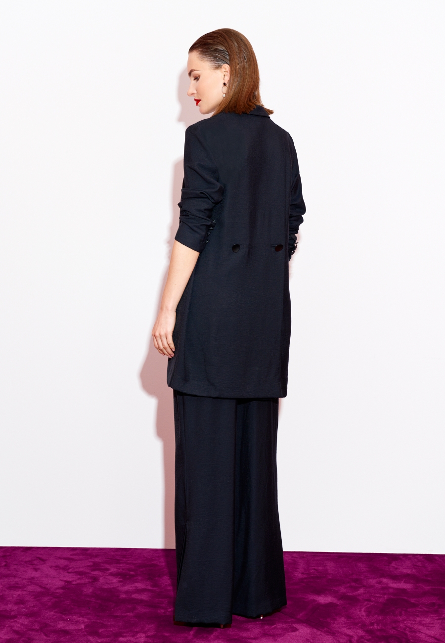 Туника, прямого силуэта, слегка расширена книзу, с застёжкой на потайную тесьму–молнию, расположенную в среднем шве спинки. Горловина переда и спинки представляет лёгкий треугольник. По полке и спинке присутствует отрезная кокетка по левой стороне. Рукав втачной, длинный, с разрезом по локтевому шву. Перед полки по низу ассиметричен.