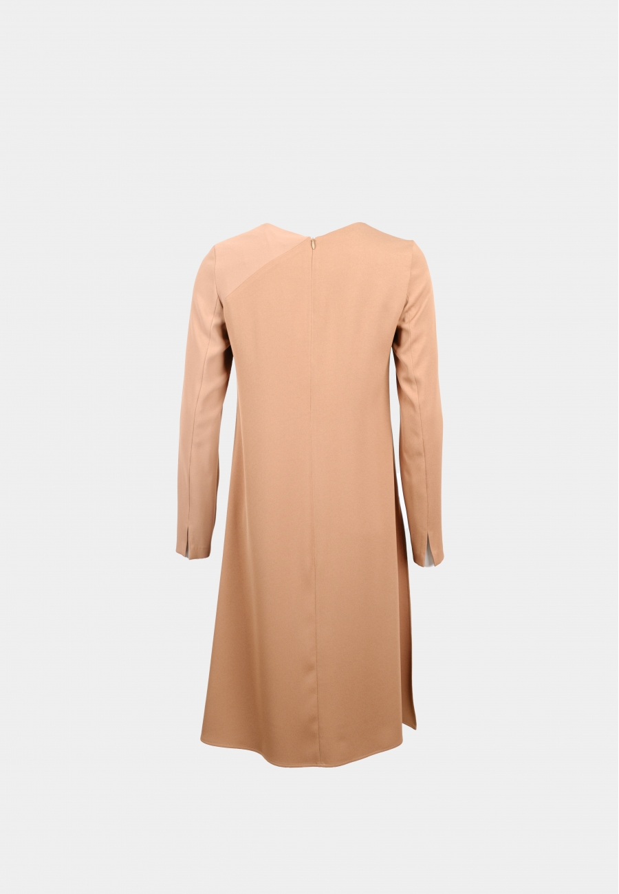 Туника, прямого силуэта, слегка расширена книзу, с застёжкой на потайную тесьму–молнию, расположенную в среднем шве спинки. Горловина переда и спинки представляет лёгкий треугольник. По полке и спинке присутствует отрезная кокетка по левой стороне. Рукав втачной, длинный, с разрезом по локтевому шву. Перед полки по низу ассиметричен.