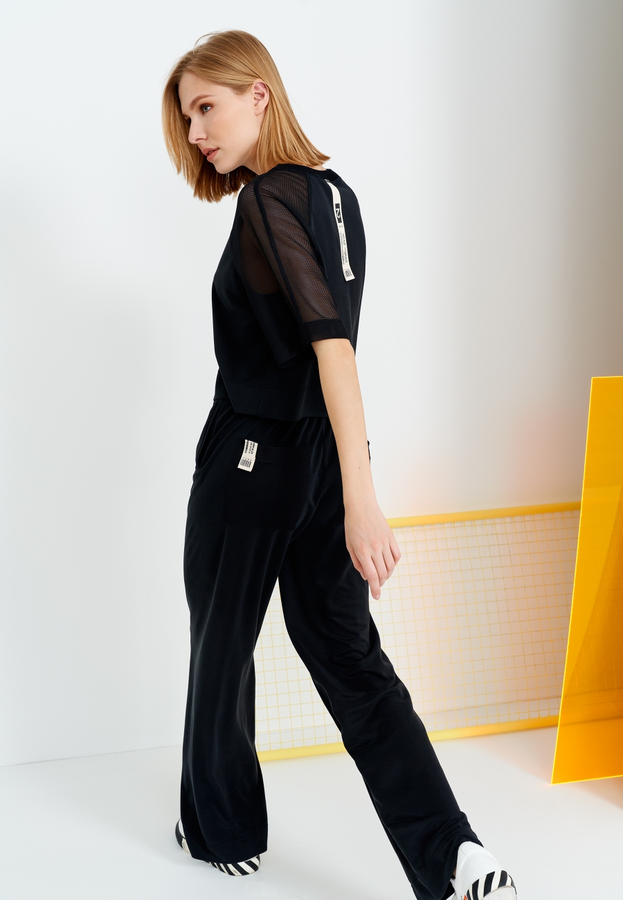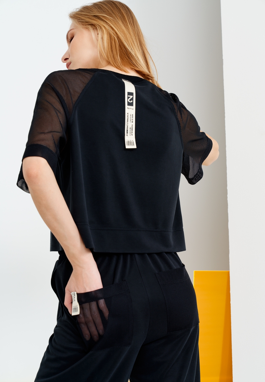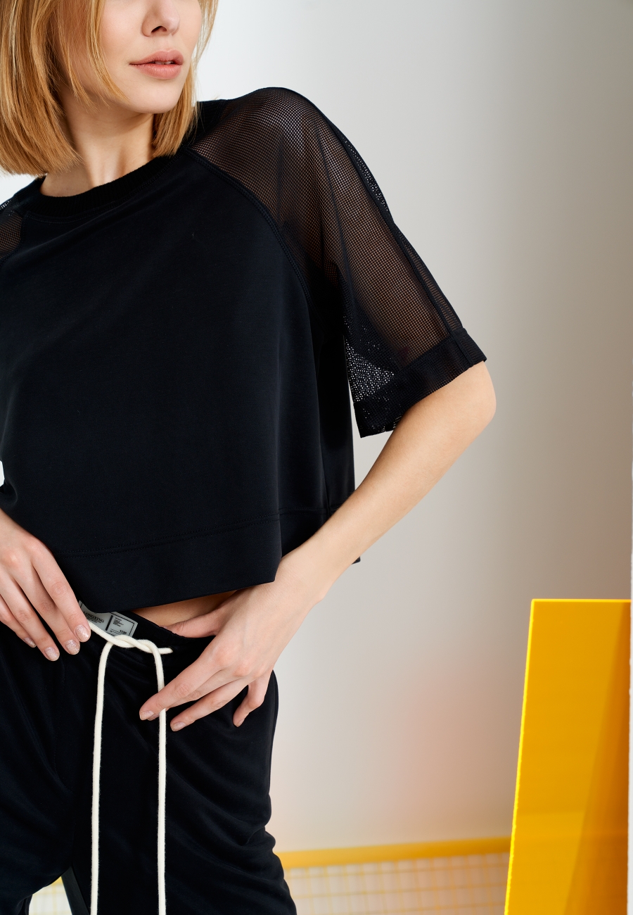 Блузка женская, короткая, прямого силуэта, с круглым вырезом горловины и короткими рукавами-реглан.Рукава выполнены с отделочной ткани.