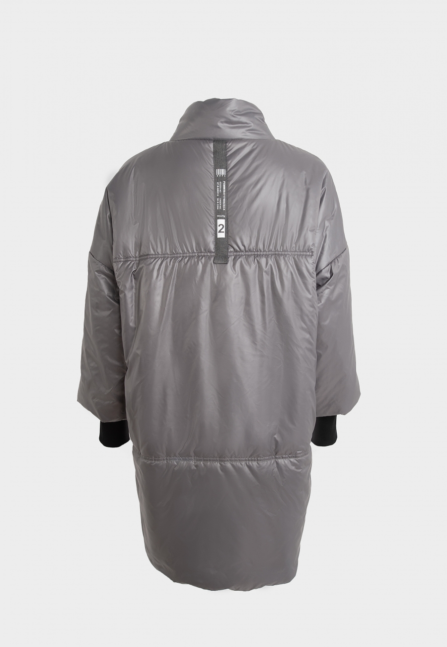 Куртка женская, удлиненная, объемная, с воротником-стойкой, спущенной линией проймы и рукавами с трикотажными манжетами по низу. По спинке и переду куртки на уровне линии груди горизонтальные подрезы. Линия низа асимметричной формы. По переду изделия карманы с широкими листочками. Застежка на кнопки по переду куртки.