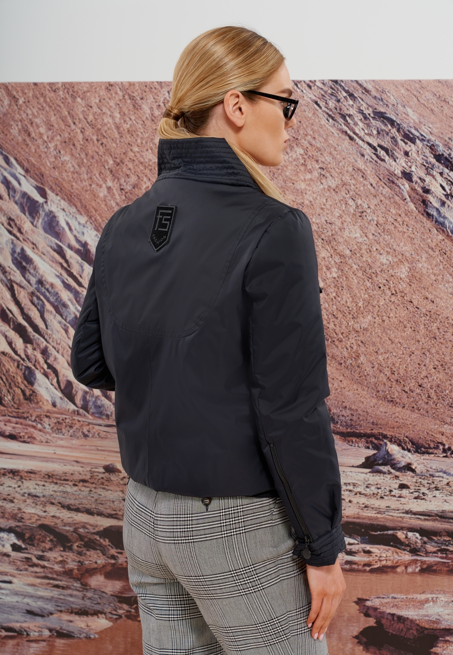 Куртка женская, объемная, короткая, с длинными втачными рукавами. Воротник-стойка фигурной формы и трикотажный довяз по горловине. По низу рукавов манжеты, застегивающиеся на кнопки и молнии в локтевых швах. По переду куртки прорезные карманы с молниями и накладные карманы с клапанами на уровне линии груди. По спинке куртки членения фигурной формы. Застежка на молнию по переду куртки.