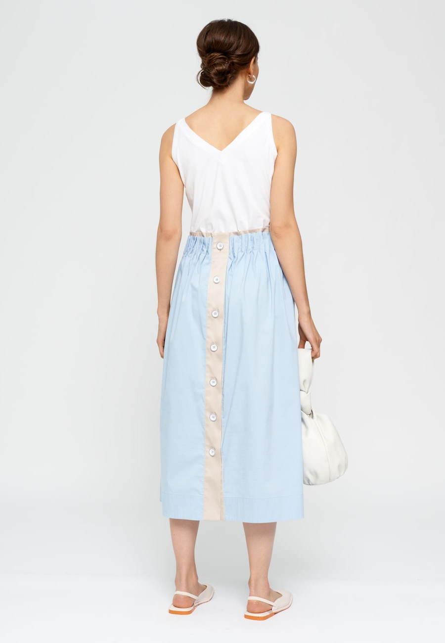 Юбка женская, расширенная книзу, длиной ниже линии колен, на резинке. По верху юбки объемные складочки, в боковых швах прорезные карманы. По спинке юбки на планке петли и пуговицы.