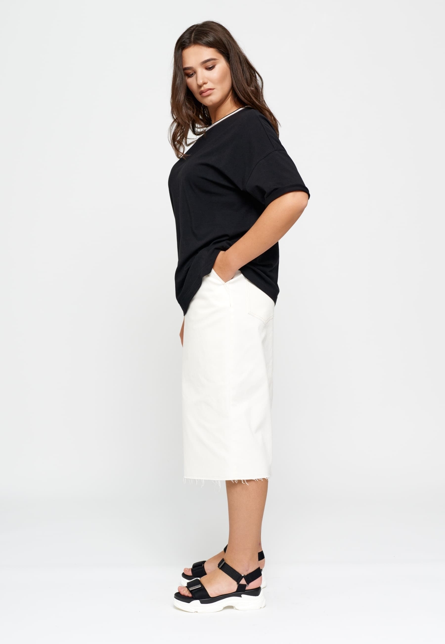 Юбка женская, прямая, в джинсовом стиле, длиной ниже линии колен. Притачной пояс с застежкой на петлю и пуговицу. Переднее полотнище с наклонными боковыми карманами, средним швом, застежкой молнией и разрезом в среднем шве. Заднее полотнище юбки с накладными карманами, кокетками и средним швом. Низ изделия оставлен необработанным. В комплекте пояс с пряжкой из отделочной тесьмы.