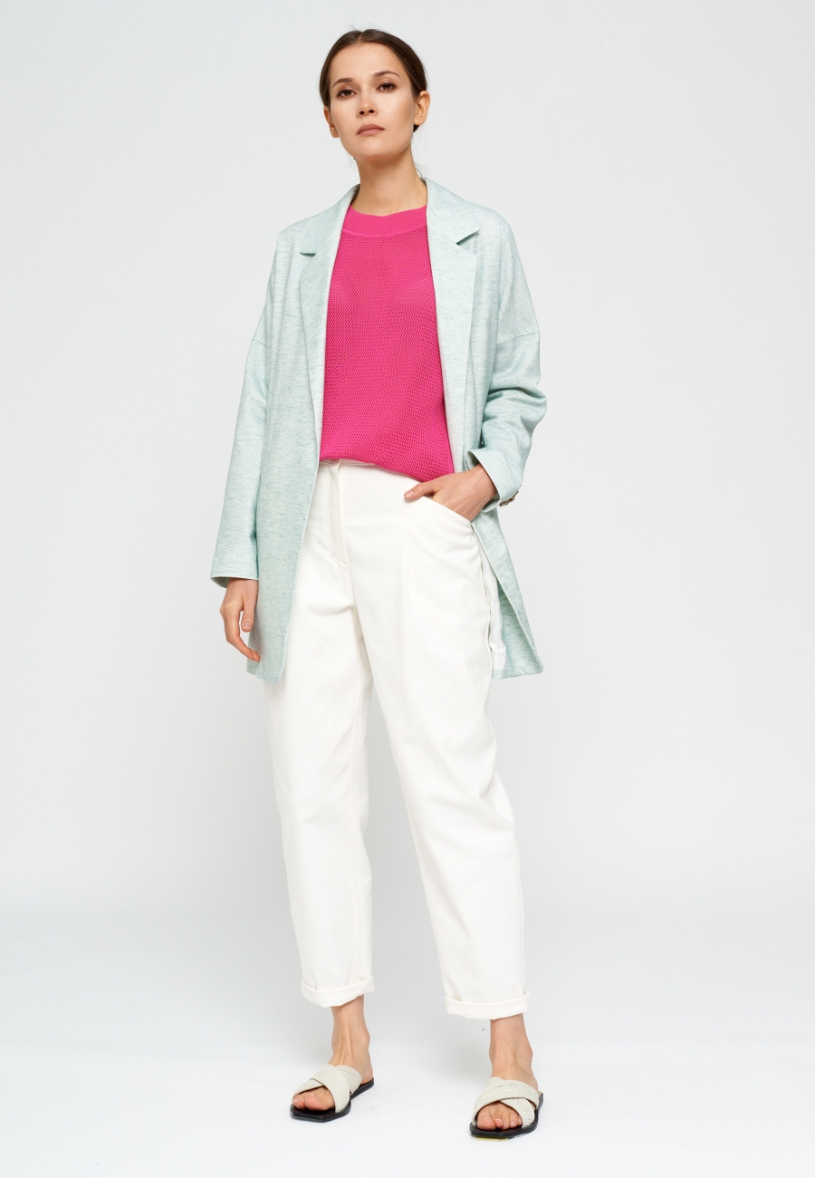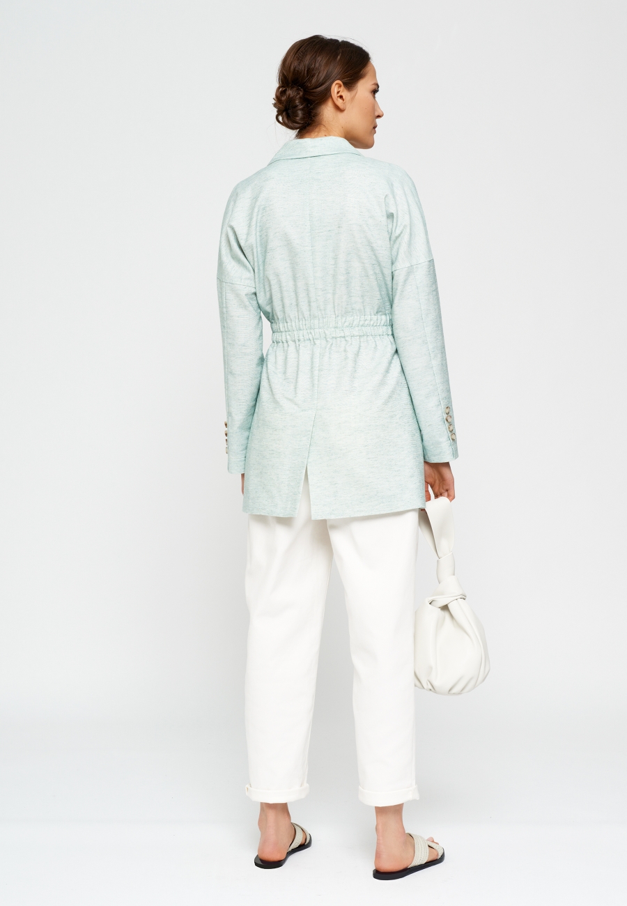 Жакет прямого силуэта, удлиненный, с центральной застежкой на потайные кнопки. Воротник пиджачного типа. Рукава двухшовные, спущенные. По переду прорезные карманы с клапанами. Спинка со средним швом, шлицей и стяжкой на резинку на уровне талии, переходящую в мягкий завязывающийся пояс.