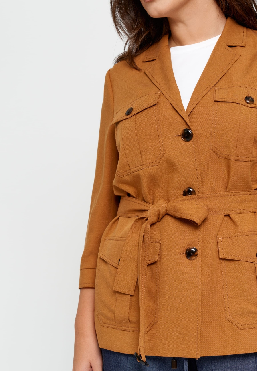 Жакет женский, удлиненный, полуприлегающего силуэта, с втачными рукавами длиной 3/4. Воротник пиджачного типа. По переду жакета расположены накладные карманы с клапанами фигурной формы. По спинке жакета расположена кокетка. По низу рукава манжет, застегивающийся на петлю и пуговицу. Застежка жакета центральная на петли и пуговицы.